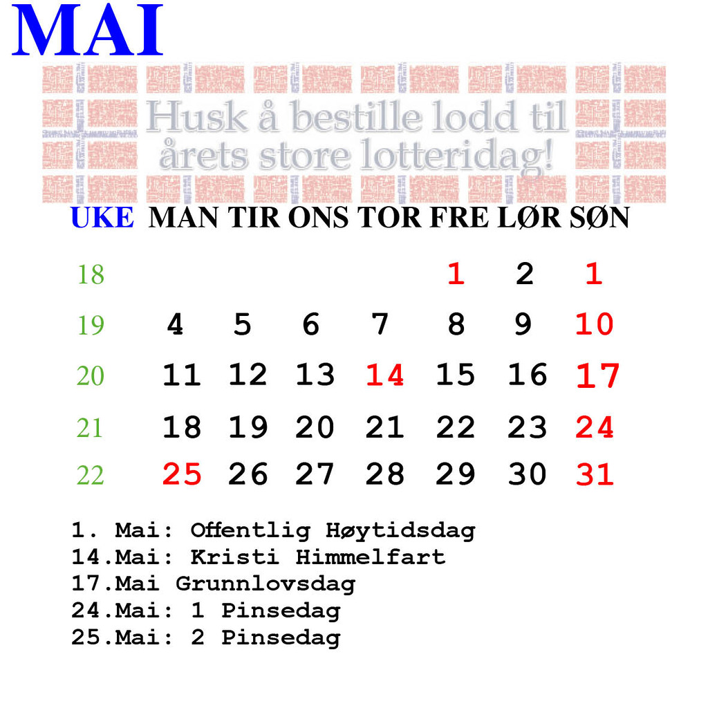 Skal du være helt trygg på å få Lynlodd og 21‑lodd før 17. mai, er våre siste utsendingsdager med garantert levering til 17. mai: